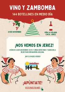 Empezaremos con una visita a la viña para conocer todos sus ‘entresijos’. Una vez que nos hayamos tomado una primera copita venenciada, pasaremos al almuerzo típico jerezano que será tipo buffet. Tendremos una mesa con queso, jamón y chacinas; otra mesa con aliños; como cuchareo degustaremos ajo campero, berza y arroz con pollo; y por último también se podrá degustar barbacoa. En la barra tendremos mosto, vinos, cervezas y refrescos. Finalmente, con el café y los dulces, tendremos una zambombá flamenca.